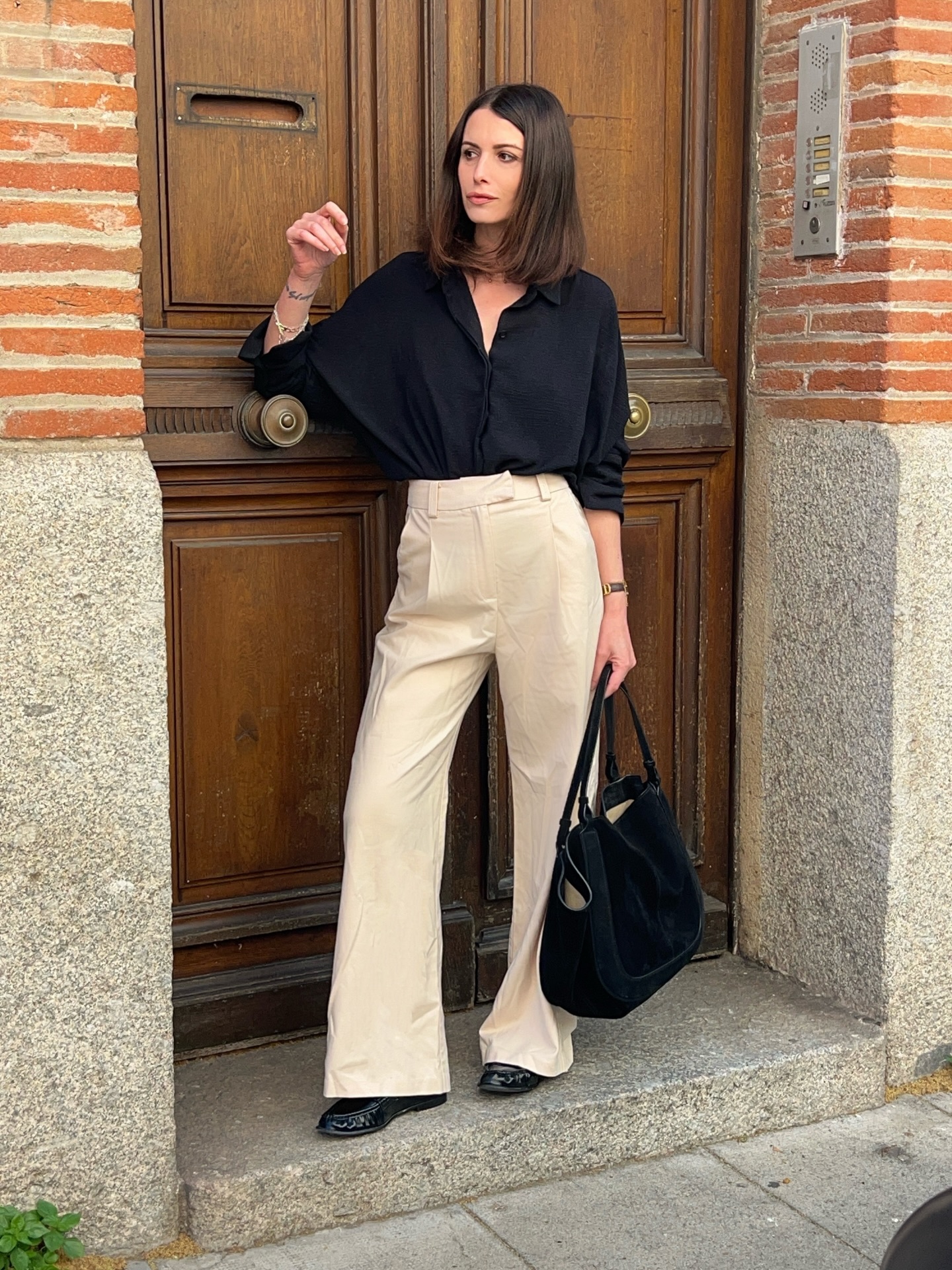 Đây là công thức "kinh điển" của thời trang công sở, nhưng phụ nữ Pháp luôn biết cách làm mới nó. Thay vì những chiếc áo sơ mi cứng nhắc, họ chọn thiết kế có độ rủ nhẹ, cổ áo mềm hoặc chi tiết tinh tế như tay áo phồng nhẹ.
