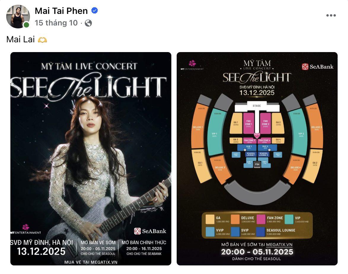 Không lâu sau, Mai Tài Phến đã có chia sẻ poster ủng hộ concert See The Light sắp tới của "tình tin đồn" tại Hà Nội. Mai Tài Phến tranh thủ khoe chữ ký trên tấm thẻ đặc biệt của Mỹ Tâm và chia sẻ cực mập mờ: "Săn em thì được, săn vé thì anh xin thua".