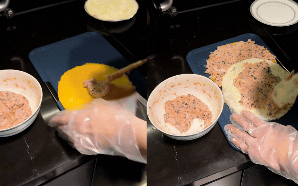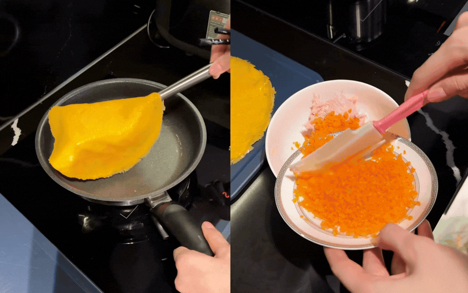 Công thức của Đỗ Hà là minh chứng cho việc: Bất cứ ai cũng có thể trở thành nghệ nhân trong chính căn bếp của mình. Thay vì mua sẵn ngoài hàng, cô chọn cách tự tay chế biến để đảm bảo vệ sinh và gửi gắm tình cảm vào món ăn. Lớp vỏ bên ngoài không phải là tàu hũ ky hay da heo cầu kỳ, mà chính là lớp trứng gà tráng mỏng vàng ươm. Để có được lớp "áo" này, trứng được đánh tan, lọc qua rây cho mịn màng rồi tráng trên chảo nóng với lửa nhỏ riu riu, sao cho trứng chín tới, dai mềm mà không bị rách. Cùng với đó là một lớp áo bằng lòng trắng trứng.