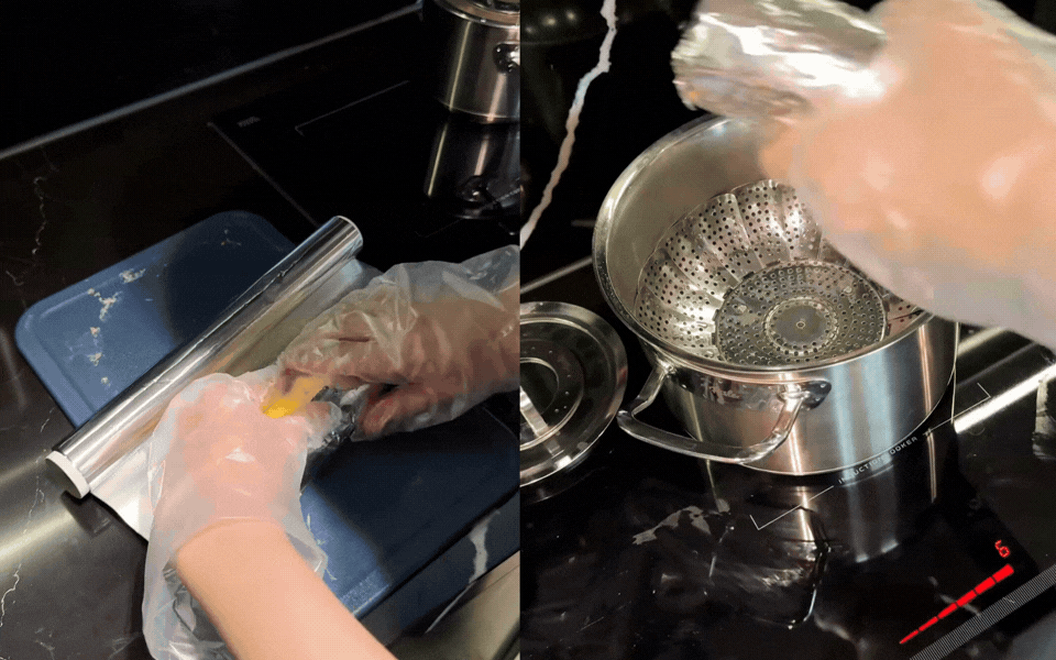Đỗ Hà còn cẩn thận bọc thêm một lớp giấy bạc bên ngoài trước khi mang đi hấp. Chi tiết nhỏ này giúp định hình cây chả tròn trịa, giữ được độ ngọt của thịt và hương thơm của trứng không bị thất thoát ra ngoài. Khi chả chín, mùi thơm lan tỏa khắp gian bếp, báo hiệu một cái Tết ấm cúng đang về rất gần.