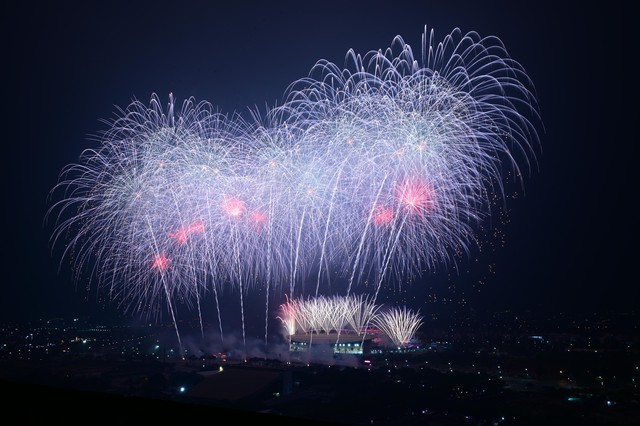 20h50, Tại SVĐ Mỹ Đình, ngay khi màn pháo hoa đầu tiên bừng sáng trên bầu trời, người dân đồng loạt hò reo, vỗ tay trong niềm hân hoan, phấn khởi.