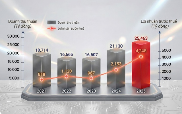 Theo báo cáo, năm 2025, GELEX Electric đạt doanh thu thuần hợp nhất 25.463 tỷ đồng, tăng 20,5% so với năm trước. Lợi nhuận trước thuế cả năm đạt 4.246 tỷ đồng, gần gấp đôi cùng kỳ, tương ứng mức tăng 97,2%.