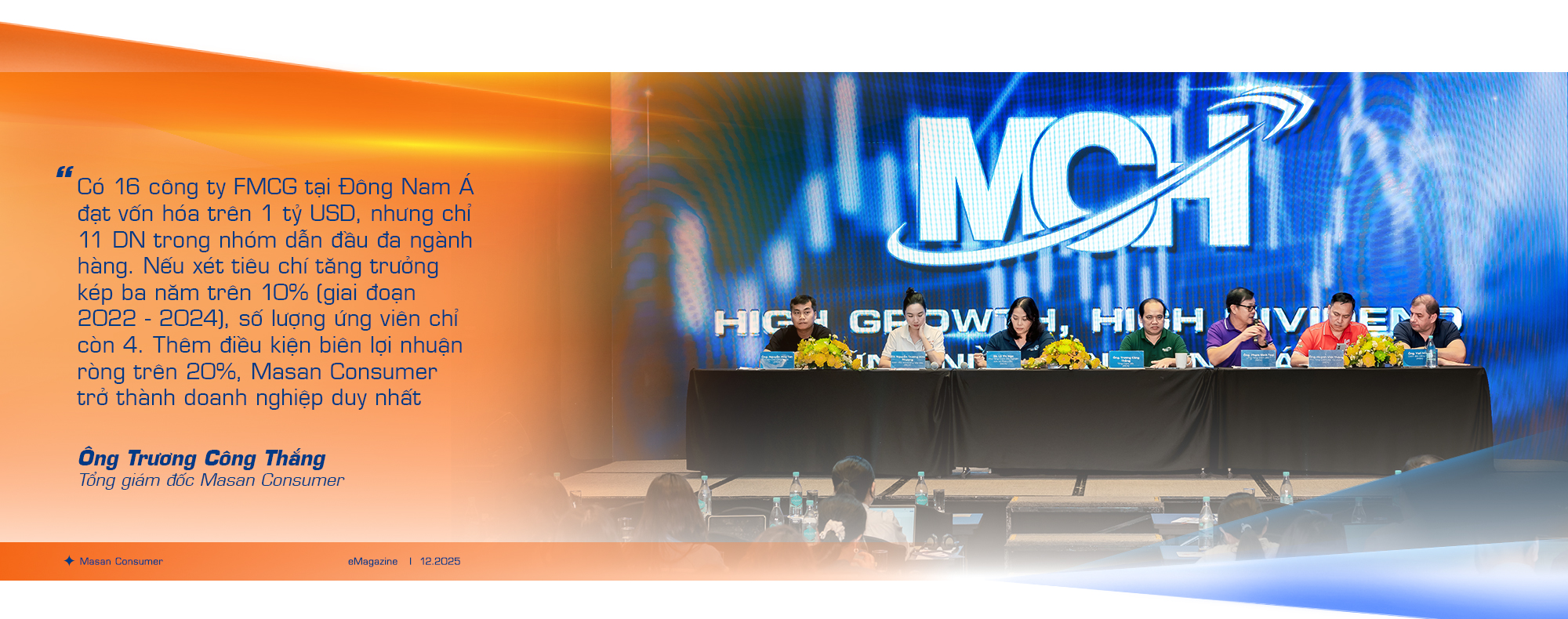 “Có 16 công ty FMCG tại Đông Nam Á đạt vốn hóa trên 1 tỷ USD, nhưng chỉ 11 DN trong nhóm dẫn đầu đa ngành hàng. Nếu xét tiêu chí tăng trưởng kép ba năm trên 10% (giai đoạn 2022 - 2024), số lượng ứng viên chỉ còn 4. Thêm điều kiện biên lợi nhuận ròng trên 20%, Masan Consumer trở thành doanh nghiệp duy nhất” - ông Trương Công Thắng - Tổng giám đốc Masan Consumer