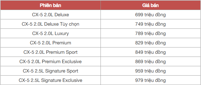 Giá bán các phiên bản Mazda CX-5.
