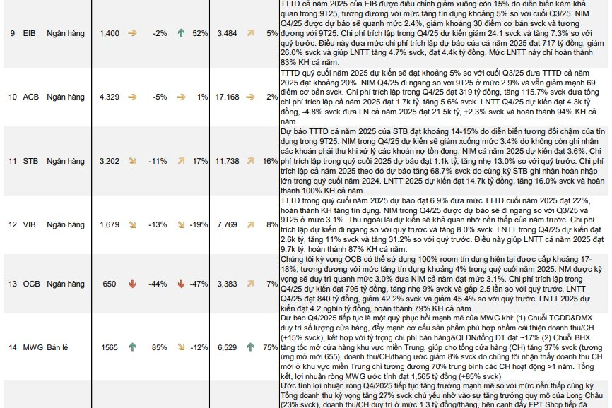 Trong nhóm ngân hàng, MBS dự báo Techcombank (TCB) là ngân hàng có mức tăng trưởng lợi nhuận quý 4/2025 cao nhất trong nhóm theo dõi. Lợi nhuận quý 4ước đạt 6.253 tỷ đồng, tăng 81% so với cùng kỳ, nhờ tín dụng phục hồi cuối năm, NIM ổn định và áp lực trích lập dự phòng giảm.