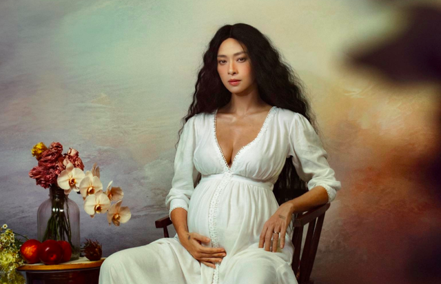 Trong bộ váy trắng tinh khôi, Ngô Thanh Vân ngồi nhẹ nhàng bên những nhành hoa và trái cây biểu tượng cho sự sống, khoe bụng bầu rõ nét. Dù đang trong giai đoạn thai kỳ cuối, gương mặt của cô vẫn giữ được thần thái mạnh mẽ, ánh mắt kiêu hãnh nhưng đầy dịu dàng – gợi nhớ hình ảnh “người mẹ bất tử” mà cô nhắc tới trong bài viết.