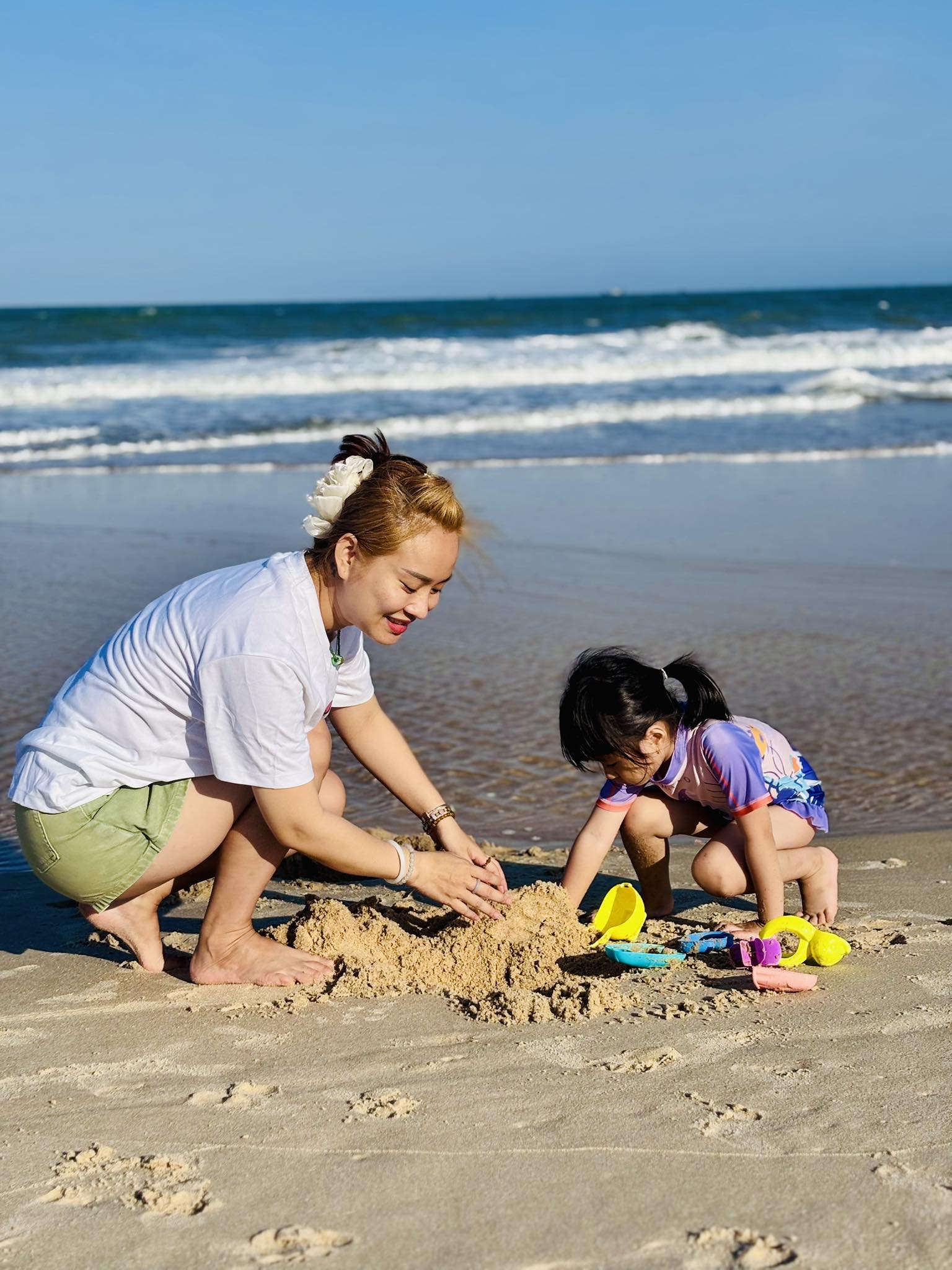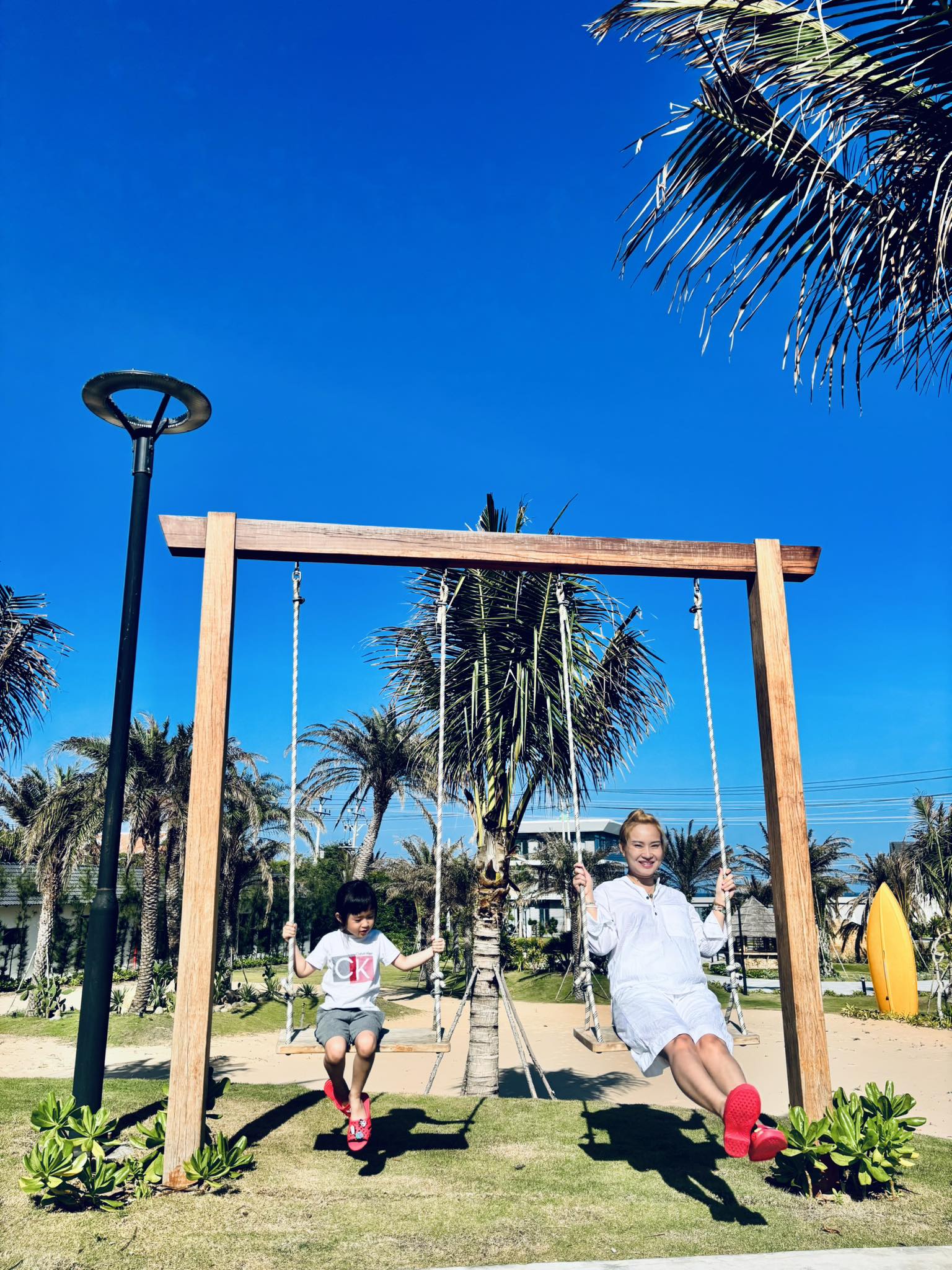 Ở những khung hình khác, bà xã Duy Phước thoải mái vui đùa cùng con trên bãi cát hay ngồi xích đu giữa không gian xanh mát. Từng cử chỉ chăm sóc con cái, nụ cười hiền hậu và phong cách ăn mặc giản dị càng làm nổi bật hình ảnh một người phụ nữ của gia đình, ưu tiên sự ấm áp hơn là vẻ ngoài hào nhoáng.