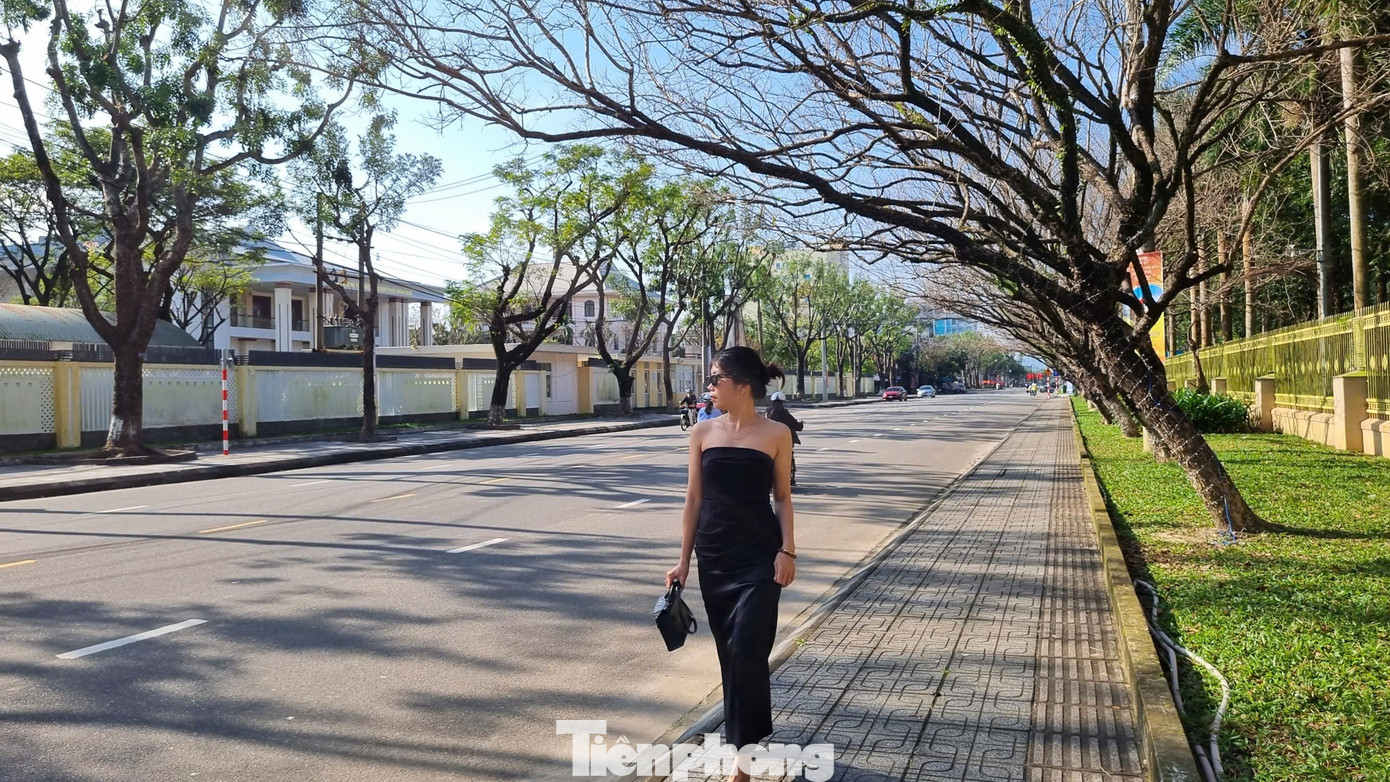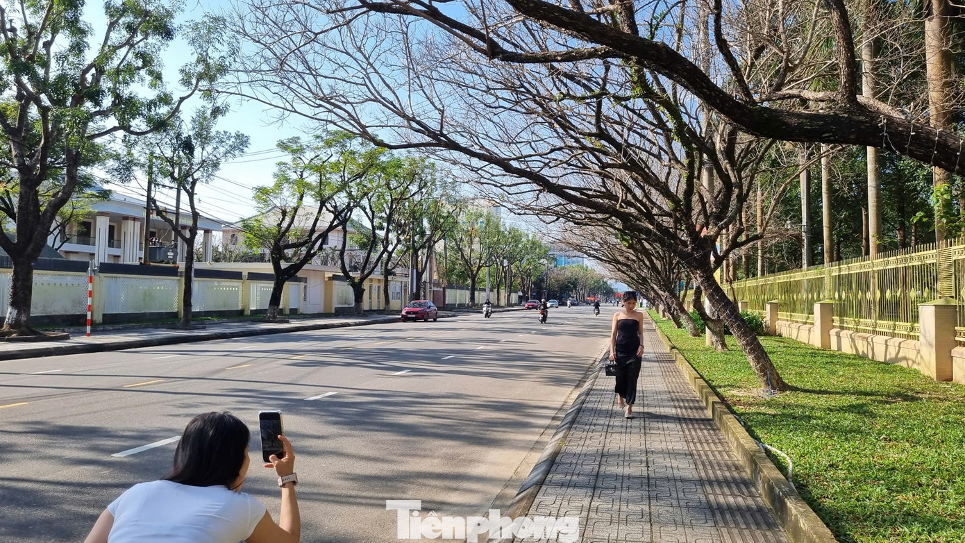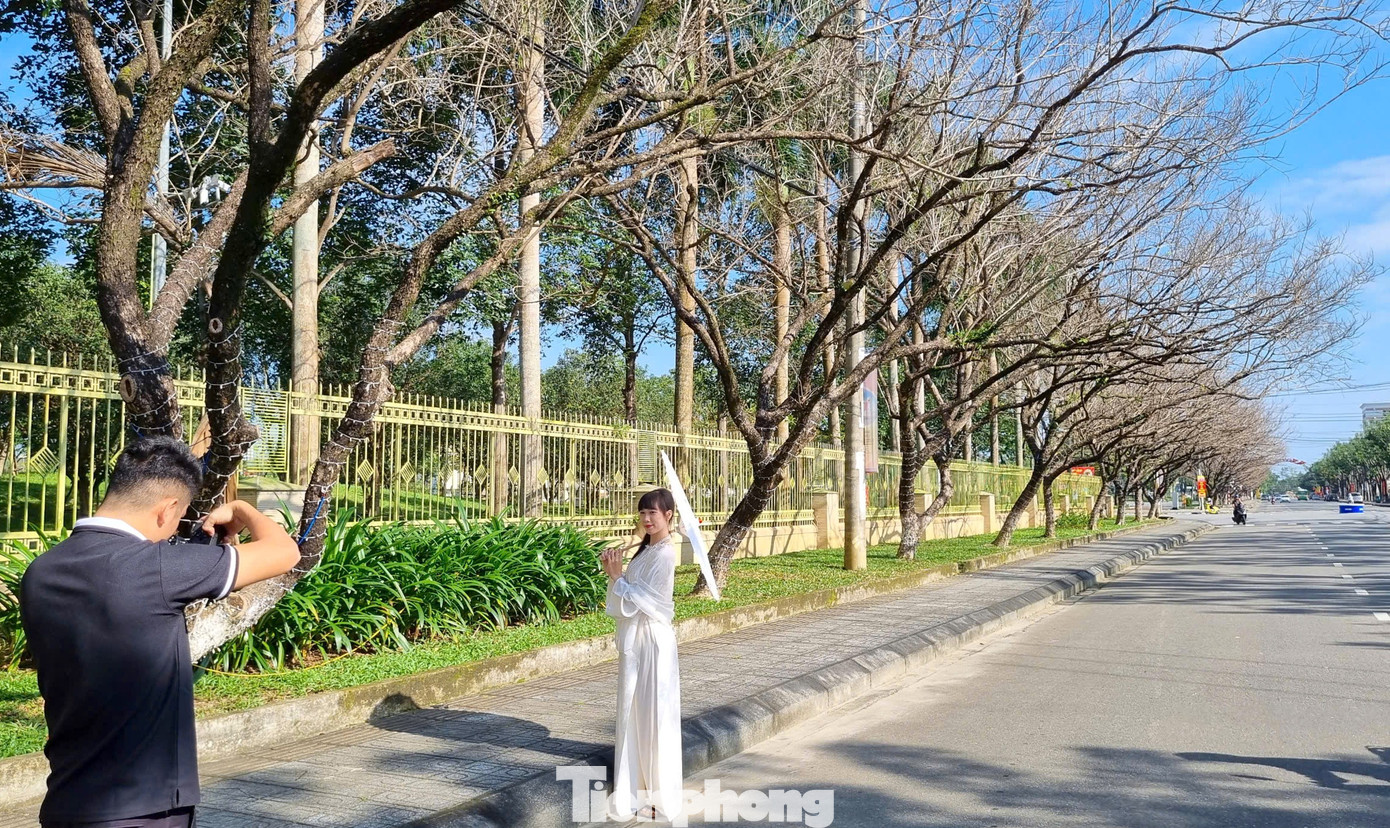 Nếu như vào mùa hạ, tuyến đường này vàng rực hoa sưa thì nay khi cây trụi lá vẫn có sức hấp dẫn riêng với bạn trẻ