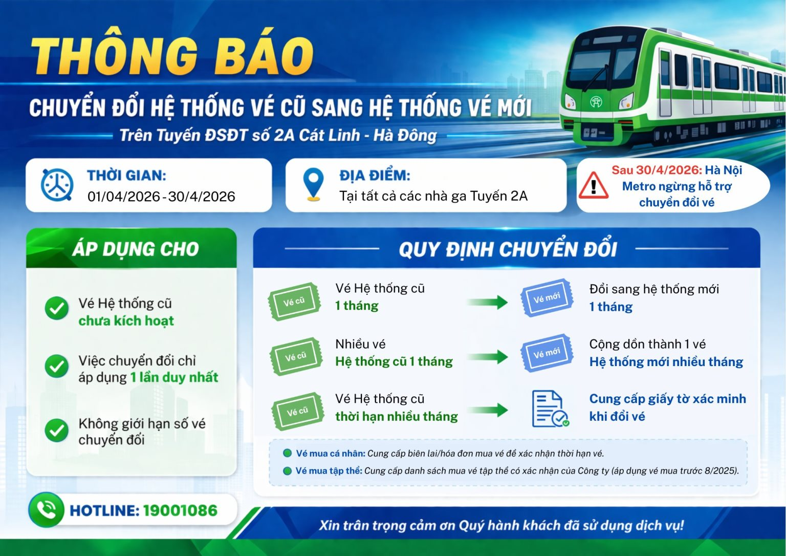 Sau ngày 30/4/2026, Hà Nội Metro sẽ không hỗ trợ chuyển đổi vé hệ thống cũ sang vé hệ thống mới.