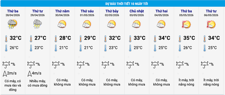 Trong hai ngày 30/4 và 1/5, khu vực này tạnh ráo trở lại, nhiệt độ cao nhất ngày tăng nhẹ lên 28-29°C, nhiệt độ thấp nhất tiếp tục giảm về mức 21°C.