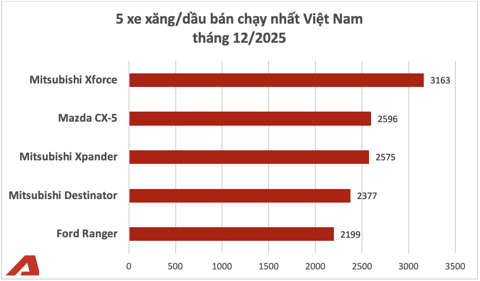 Mẫu xe đóng góp doanh số nhiều nhất tháng cuối năm 2025 là Xforce với 3.163 xe bán ra, vượt qua cả Xpander (2.575 xe). Đây là lần hiếm hoi một mẫu SUV của Mitsubishi có doanh số tháng cao hơn Xpander, dòng MPV vốn giữ vai trò đóng góp lớn nhất vào tổng doanh số của hãng trong nhiều năm qua. Ngoài ra, “hiện tượng” mới mang tên Destinator cũng đóng góp lớn với 2.377 xe bán ra.