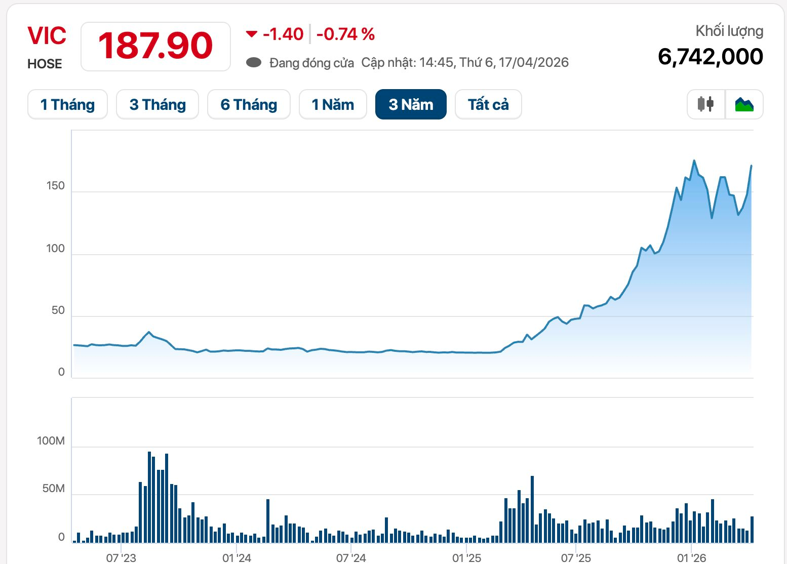 Cụ thể, Vinpearl đã chuyển nhượng gần 5,2 triệu cổ phiếu VIC. Giao dịch được thực hiện trong ngày 16/4/2026, theo hình thức chuyển quyền sở hữu ngoài hệ thống giao dịch chứng khoán, thông qua Tổng Công ty Lưu ký và Bù trừ chứng khoán Việt Nam.
