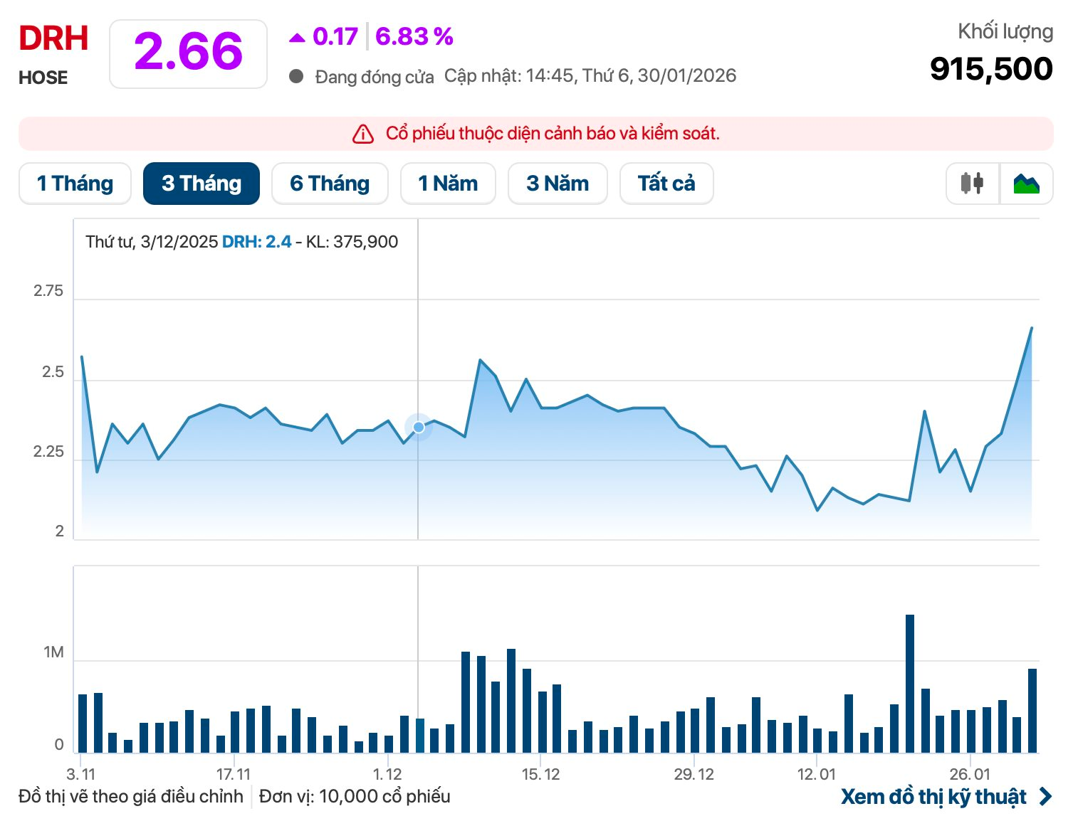 Cổ phiếu tăng mạnh sau khi công bố kết quả kinh doanh quý 4 và năm 2025 đột biến. Trong quý 4, DRH ghi nhận doanh thu thuần khoảng 3 tỷ đồng, cao gấp nhiều lần so với cùng kỳ năm trước. Tuy nhiên, giá vốn lên tới 9 tỷ đồng khiến hoạt động kinh doanh cốt lõi tiếp tục thua lỗ, với lợi nhuận gộp âm gần 6 tỷ đồng.