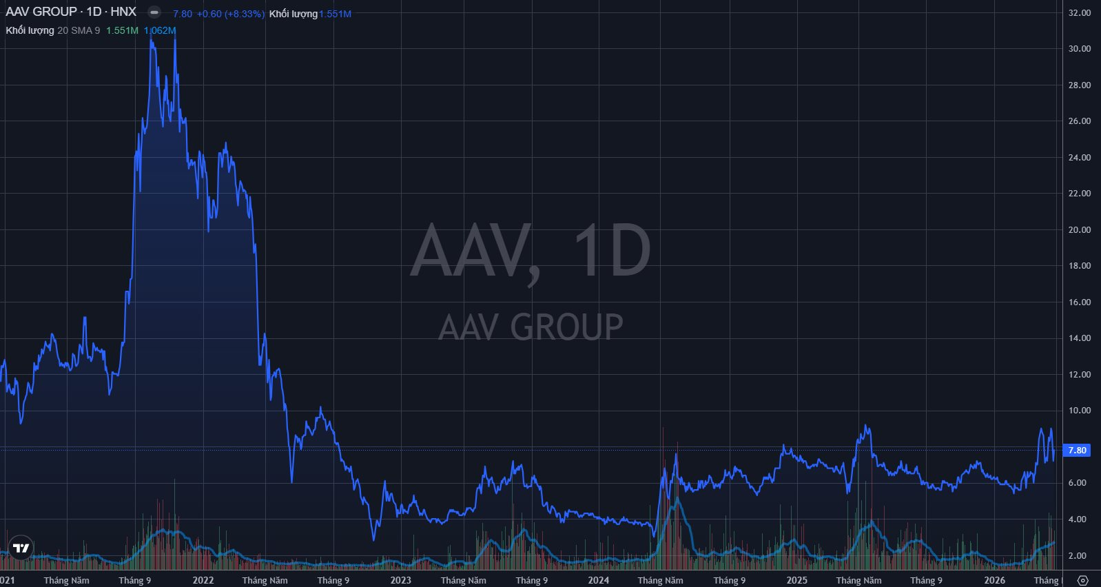 Trong quá khứ, AAV nhiều lần dậy sóng với mức tăng trên 100% sau vài tháng. Giai đoạn 19/7/2021 – 1/10/2021 cổ phiếu tăng gần 190%, giai đoạn 16/4/2024 - 30/5/2024 tăng 153%, giai đoạn 9/4/2025 – 15/5/2025 tăng 70%.