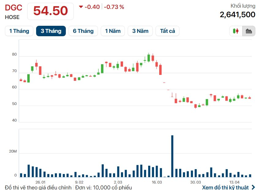 Trên thị trường, chốt phiên giao dịch ngày 17/4, cổ phiếu DGC dừng ở mức 54.500 đồng/cp, giảm 0,73% với khối lượng giao dịch hơn 2,6 triệu đơn vị.