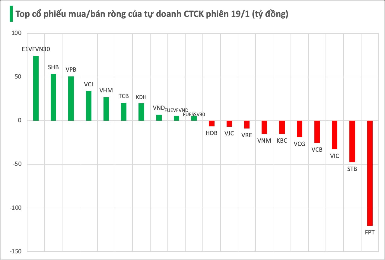 Cụ thể, nhóm tự doanh CTCK bán ròng mạnh nhất tại FPT với giá trị -120 tỷ đồng, tiếp theo là STB (-47 tỷ), VIC (-33 tỷ), VCB (-25 tỷ) và VCG (-19 tỷ đồng). Một số cổ phiếu khác cũng ghi nhận lực bán ròng đáng kể như KBC (-15 tỷ), VNM (-15 tỷ), VRE (-9 tỷ), VJC (-7 tỷ) và HDB (-7 tỷ đồng).