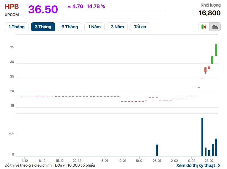Phiên sáng 25/2, cổ phiếu HPB tăng trần lên 36.500 đồng/cp, nối dài chuỗi 6 phiên tăng liên tiếp, trong đó có 2 phiên tăng trần ngay trước kỳ nghỉ Tết Nguyên đán.