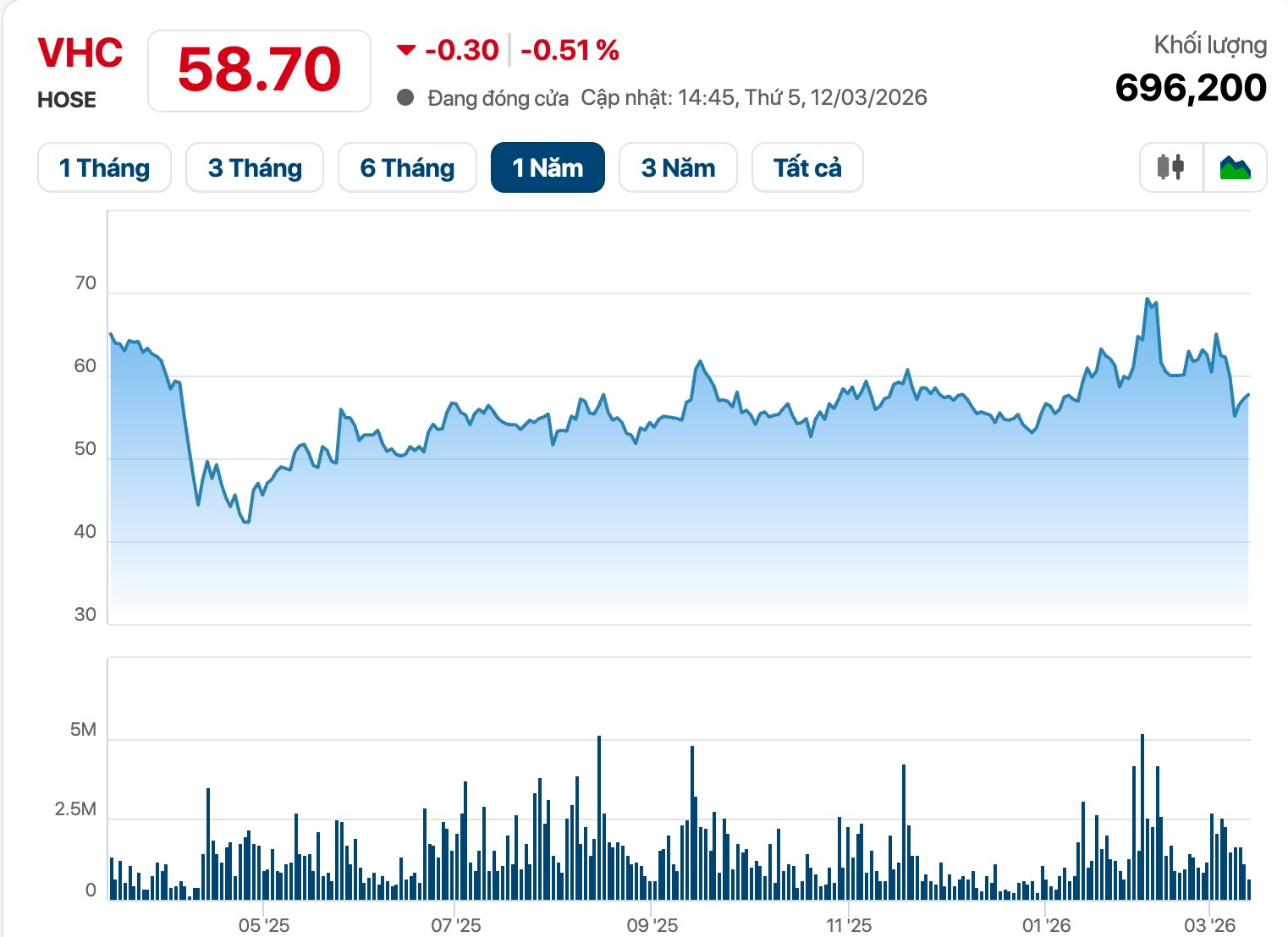 Trên sàn chứng khoán, cổ phiếu VHC đóng cửa phiên giao dịch ngày 12/3 ở mức 58.700 đồng/cổ phiếu, thấp hơn khoảng 7% so với mức giá mua tối đa mà công ty đưa ra.