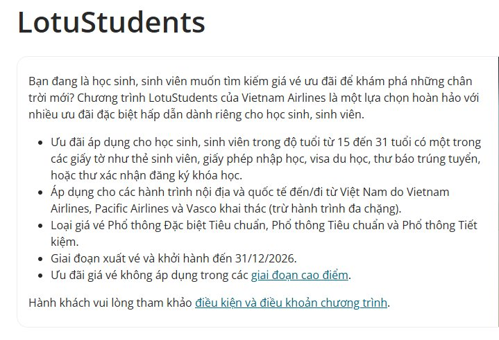 Khách hàng tham gia không chỉ tận hưởng các chính sách giảm giá vé độc quyền mà còn được tích hợp song song mọi quyền lợi của Chương trình Bông Sen Vàng hiện hành. Thông tin chi tiết về các dịch vụ bổ trợ và chính sách hành lý miễn cước sẽ được tự động cập nhật rõ ràng trong quá trình đặt vé, giúp người trẻ tối ưu hóa chi phí hiệu quả.