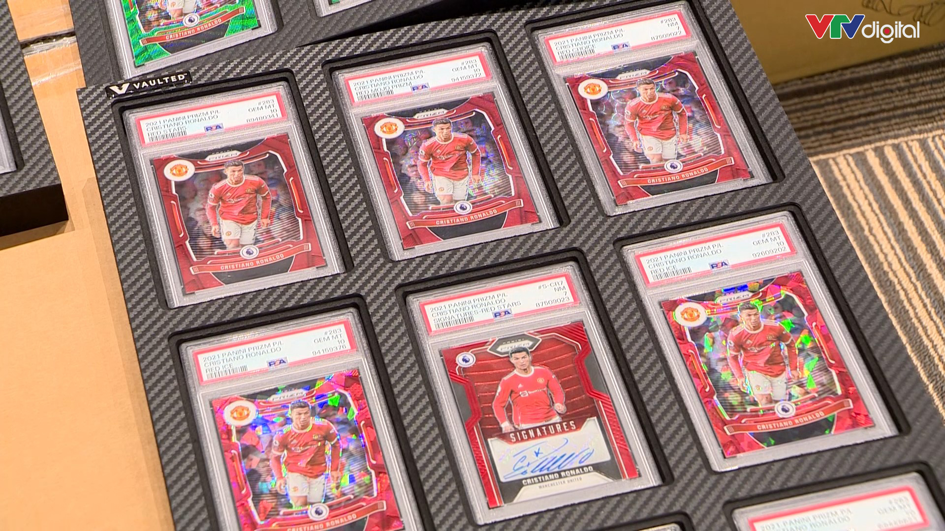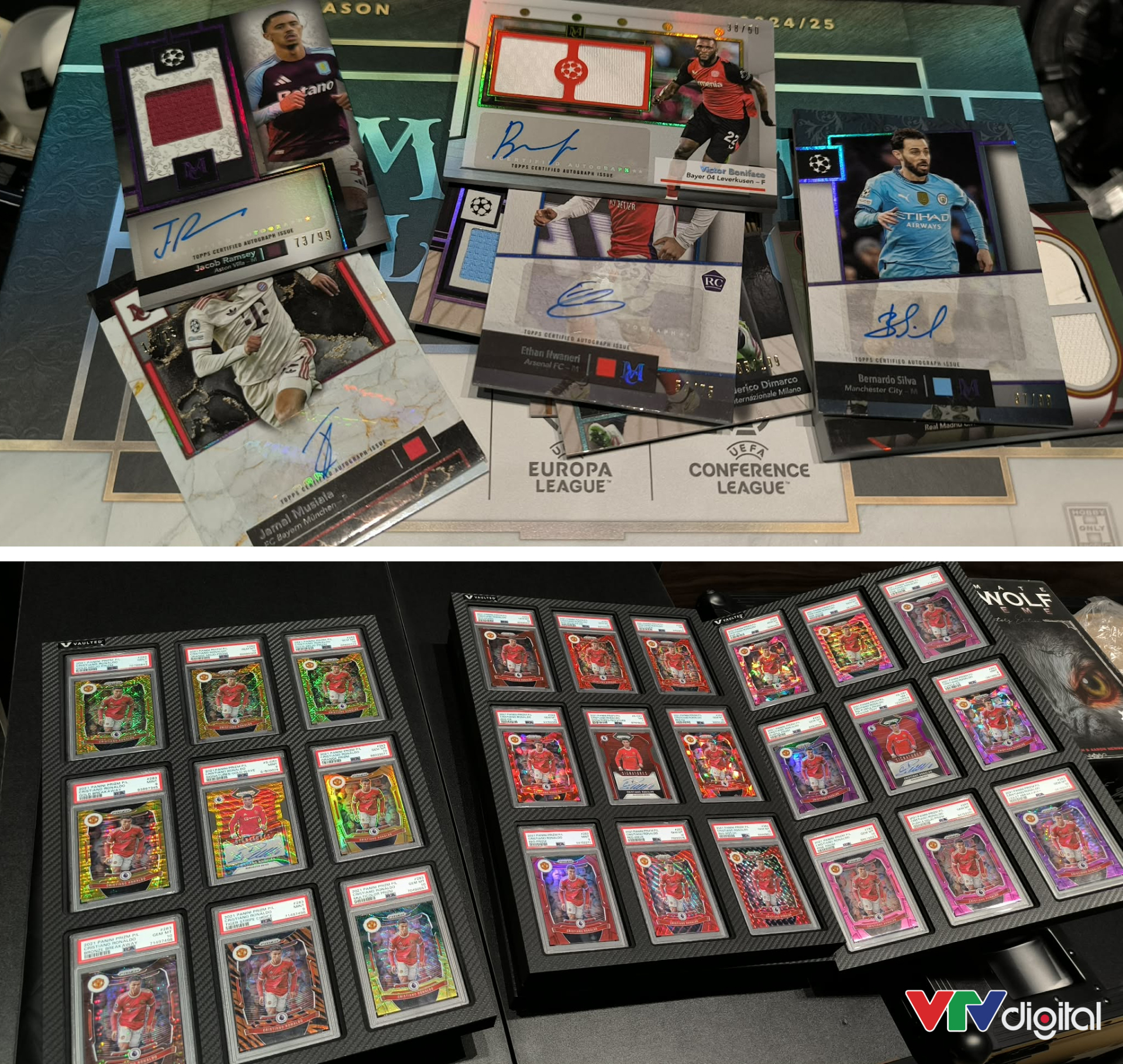 Một số hình ảnh cho thấy các thẻ cầu thủ nổi tiếng hiếm, có chữ ký, được bảo quản trong hộp chuyên dụng. Ngoài ra còn có nhiều mô hình nhân vật kích thước lớn và tượng sưu tầm đắt tiền được trưng bày trong tủ kính.