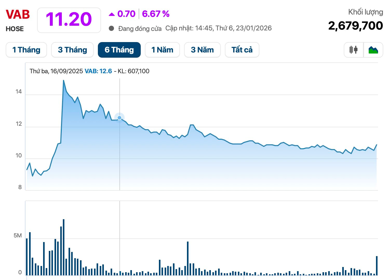 Đáng chú ý, nhịp bứt tốc của VAB diễn ra sau giai đoạn giằng co kéo dài. Dù vậy so với mức giá cách đây khoảng 5 tháng, cổ phiếu này vẫn giảm xấp xỉ 25%.