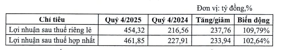 Theo báo cáo tài chính hợp nhất quý 4/2025, VietABank ghi nhận thu nhập lãi thuần hơn 1.608 tỷ đồng, tăng 97,7% so với cùng kỳ, lợi nhuận sau thuế đạt 461,85 tỷ đồng, tăng 102,64%.