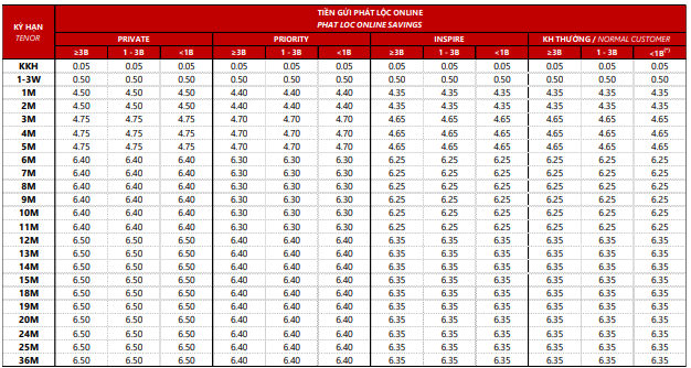 Đối với nhóm kỳ hạn dài từ 12 – 36 tháng, lãi suất cũng được điều chỉnh tăng tương tự. Mức lãi suất đối với khách hàng thông thường tăng từ khoảng 5,75%/năm trong tháng 2 lên 6,35%/năm trong tháng 3, tức tăng khoảng 0,6 điểm %. Trong khi đó, với các phân khúc khách hàng cao cấp hơn như Priority hoặc Private, lãi suất kỳ hạn dài hiện dao động từ khoảng 6,4% đến 6,5%/năm, cao hơn so với nhóm khách hàng phổ thông nhưng vẫn giữ nguyên khoảng chênh lệch so với tháng trước.