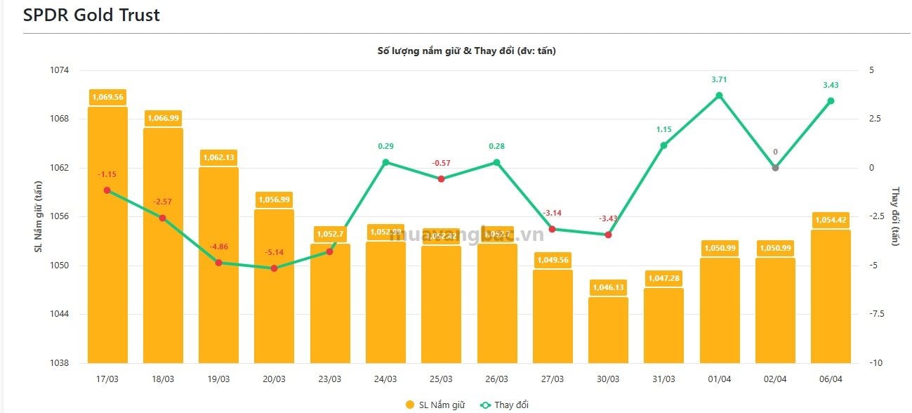 Theo cập nhật từ Muavangbac.vn, quỹ vàng lớn nhất thế giới SPDR Gold Shares đã mua ròng 3,43 tấn vàng trong ngày 6/4, nâng tổng lượng nắm giữ lên 1.054 tấn.