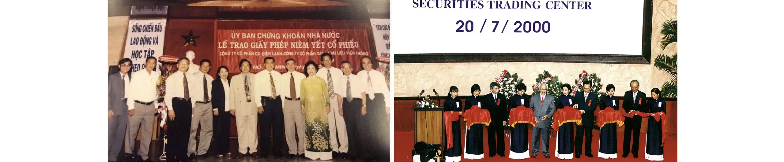 Lễ trao giấy phép niêm yết cổ phiếu (trái) và Lễ Khai trương hoạt động Trung tâm Giao dịch Chứng khoán TP. Hồ Chí Minh ngày 20/7/2000 (phải)