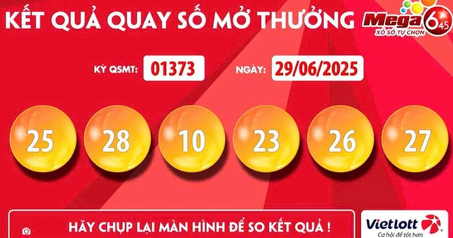 Tối 29-6, Công ty Xổ sổ điện toán Việt Nam (Vietlott) công bố tại kỳ quay số chiều cùng ngày có 1 vé loại hình Mega 6/45 trúng giải Jackpot trị giá trên 127,2 tỉ đồng.