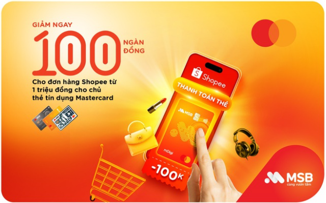Đồng hành cùng mùa mua sắm cuối năm, từ này đến 28/02/2026, MSB triển khai ưu đãi giảm 100.000 VNĐ cho đơn hàng Shopee từ 1 triệu đồng khi thanh toán qua thẻ MSB Mastercard. Chương trình áp dụng tối đa 02 lần/ tháng cho mỗi thẻ và giới hạn số lượng lượt ưu đãi theo tuần.
