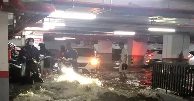 Video nước cuốn như thác vào tầng hầm khiến nhiều phương tiện bị ngập