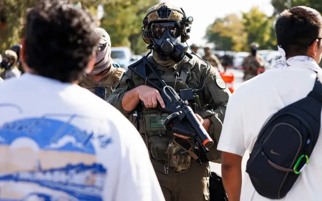 Các sĩ quan liên bang đứng gác tại khu phố Brighton Park ở Chicago hôm 4/10/2025, sau khi những người biểu tình phản đối việc Lực lượng Biên phòng Hoa Kỳ đã bắn một phụ nữ