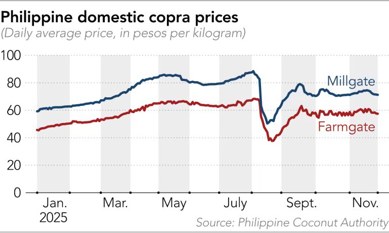 Trên thị trường, giá cơm dừa do chính phủ công bố cuối tháng 11 ở mức 57,52 peso/kg tại vườn, trong khi thương nhân bán cho nhà máy với giá 71,29 peso/kg. Dù giá đã tăng hơn 26% so với đầu năm, mức chênh lệch giữa các nấc trung gian vẫn khiến nông dân ít được hưởng lợi.