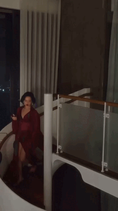 Khu vực tầng trên của căn duplex được dành trọn cho không gian nghỉ ngơi của vợ chồng Khánh Linh. Nối liền hai tầng là cầu thang xoắn ốc mềm mại, vừa đảm nhiệm công năng vừa đóng vai trò như một điểm nhấn giàu tính thẩm mỹ. Lên đến tầng trên, cặp đôi khéo léo bố trí gương lớn cùng kệ tủ nhỏ phía ngoài nhằm tạo điểm nhấn trang trí, đồng thời thuận tiện cho việc fitting quần áo hay đơn giản là trở thành góc check-in lý tưởng trong nhà.