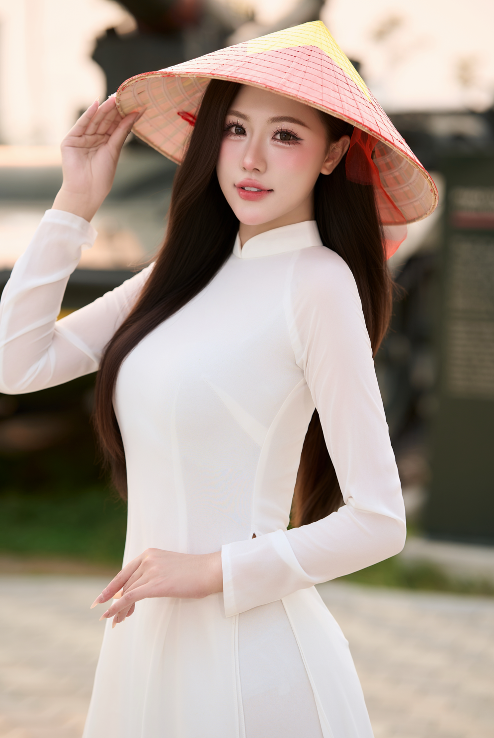 Trong bộ ảnh, Phương Anh lựa chọn áo dài trắng tinh khôi kết hợp cùng nón lá – biểu tượng quen thuộc của vẻ đẹp Việt. Giữa không gian giàu giá trị lịch sử, hình ảnh này tạo nên sự đối lập đầy cảm xúc: một bên là nét mềm mại, nữ tính; một bên là những dấu tích chiến tranh gợi nhắc về quá khứ hào hùng. Sự hòa quyện ấy mang lại cảm giác lắng đọng, khiến mỗi khung hình không chỉ đẹp về thị giác mà còn giàu ý nghĩa.