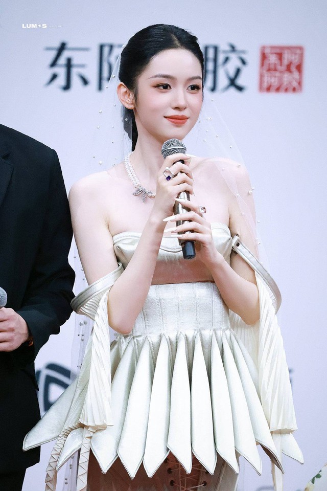 Với chi tiết phần ngực nhô ra cùng chiếc váy corset, Châu Dã mang đến sự phá cách, sáng tạo độc đáo trong thời trang. Bước lên thảm đỏ Tinh Quang Đại Thưởng, cô nàng khoe ra vẻ đẹp thanh thuần mà lạnh băng, khí chất sang chảnh tràn ngập mỗi khung hình. Tuy nhiên, chiếc voan dài thướt tha đã bị mắc vào một thanh sắt trang trí thảm đỏ đằng sau khiến Châu Dã ngã ngửa ra sau.