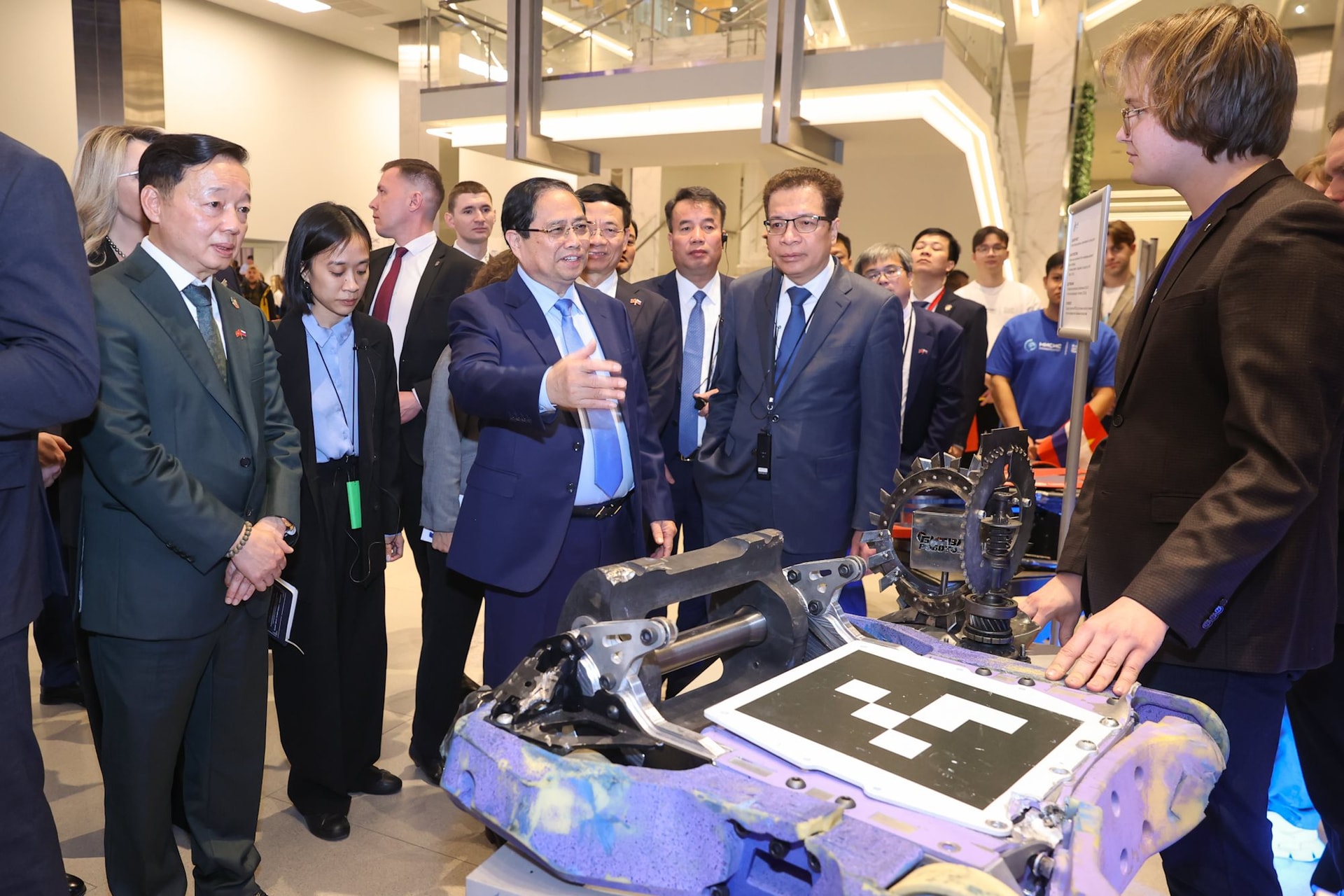 Thủ tướng Phạm Minh Chính và Phó Thủ tướng Trần Hồng Hà xem sản phẩm nghiên cứu của sinh viên MISIS. Ảnh: VGP