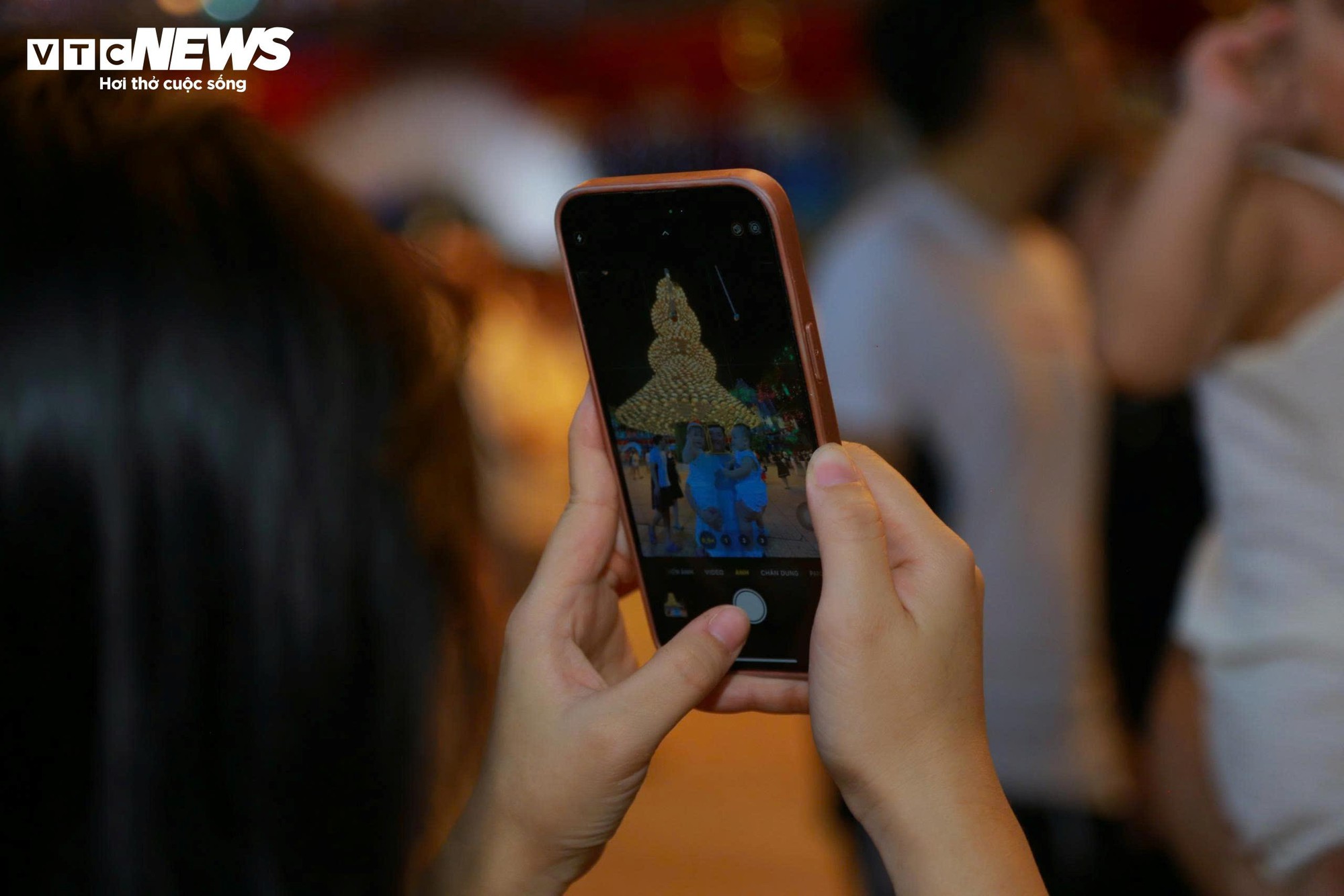 Du khách ghi lại hình ảnh cây thông bằng điện thoại. Càng về tối, lượng người đổ về khuôn viên nhà thờ càng đông.
