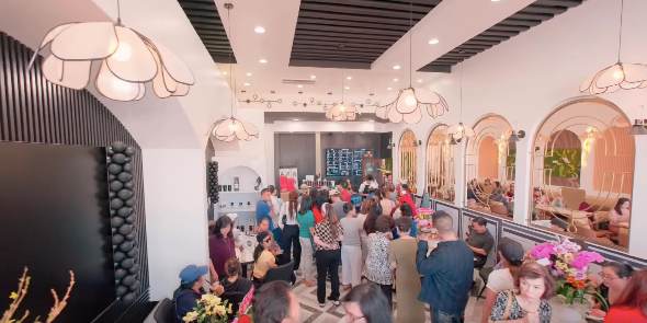 Qua những hình ảnh được cặp đôi chia sẻ trên mạng xã hội, “con chung” của cả hai gây ấn tượng với không gian rộng rãi, thiết kế hiện đại pha chút ấm cúng. Tông màu chủ đạo trắng – đen kết hợp cùng hệ đèn trần kiểu dáng mềm mại tạo cảm giác sang trọng nhưng vẫn gần gũi. Bên trong quán được bố trí nhiều bàn ghế gọn gàng, xen kẽ các khu vực trang trí hoa tươi, phù hợp cho cả gặp gỡ bạn bè lẫn làm việc.