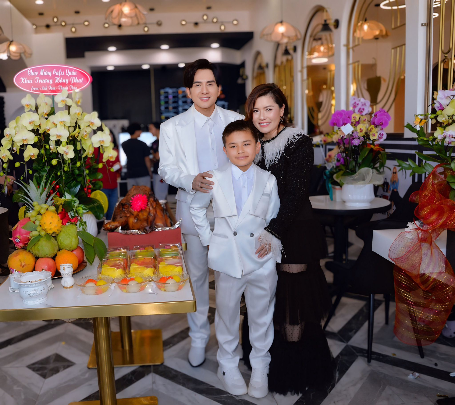 Đan Trường và vợ cũ cùng con trai trong ngày khai trương.