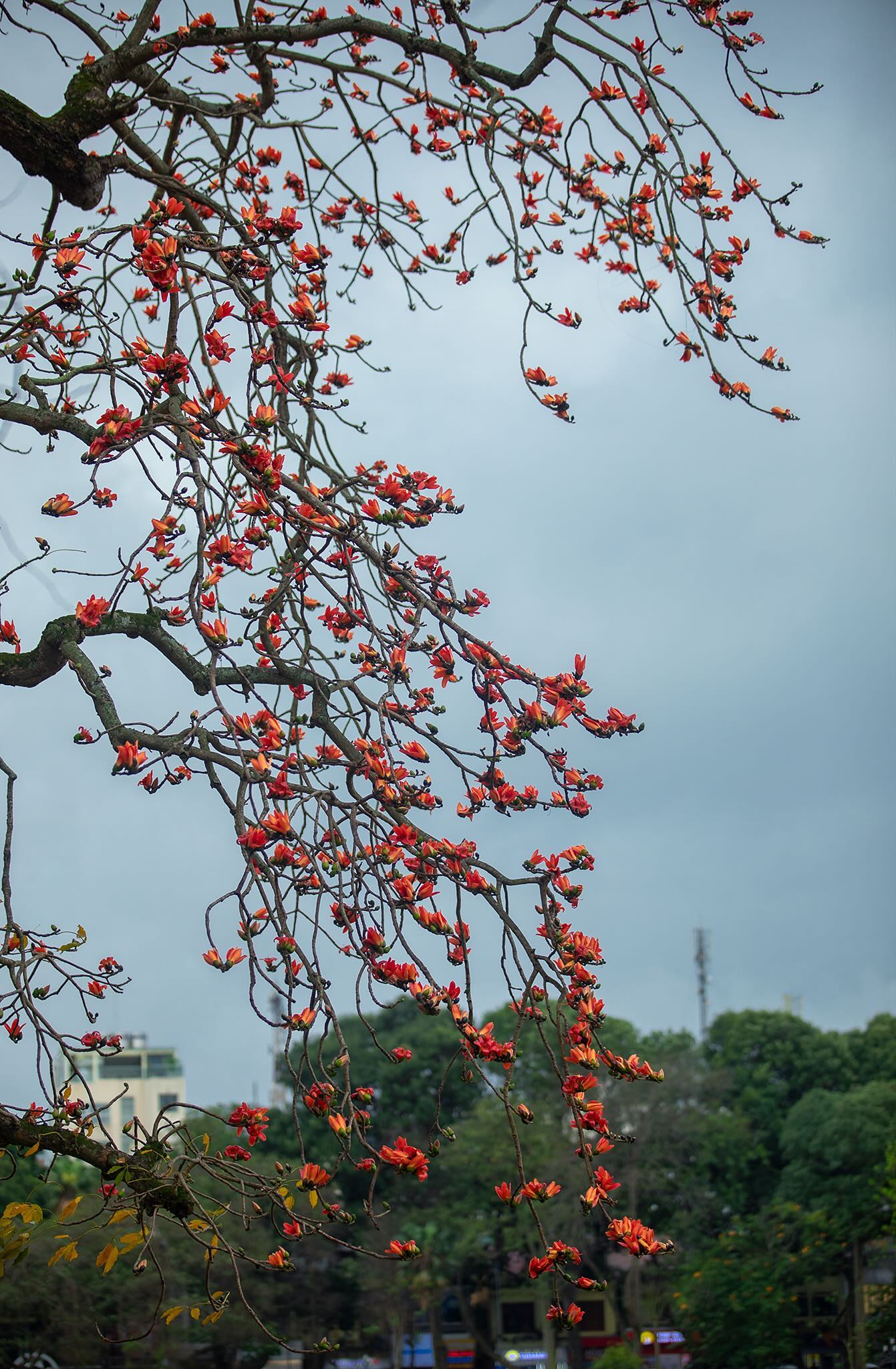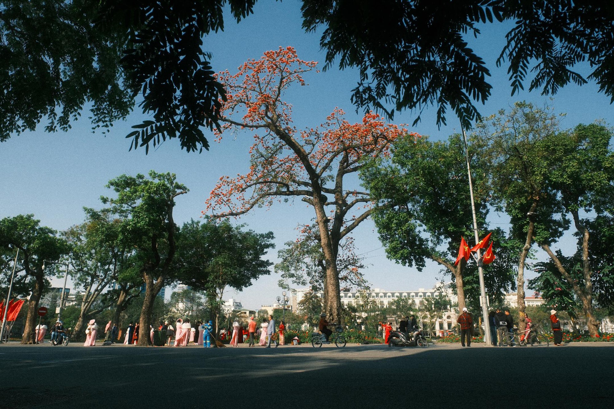 Còn với những người trẻ bận rộn, chỉ cần một buổi chiều tan tầm đi ngang qua đây, thấy hoa gạo nở là thấy lòng bỗng chùng xuống, an yên đến lạ. Sắc đỏ của hoa gạo không kiêu kỳ như hoa hồng, không mỏng manh như hoa sưa, mà nó mang một vẻ đẹp chân chất, mộc mạc của làng quê Bắc Bộ xưa cũ. Nó gợi nhắc người ta nhớ về tuổi thơ, về cổng làng, về những chiều chạy theo lũ bạn nhặt hoa gạo rụng xâu thành chuỗi. Giữa trung tâm Thủ đô hiện đại và sầm uất, tìm đâu ra một bóng dáng quê nhà thân thương và gần gũi đến thế.