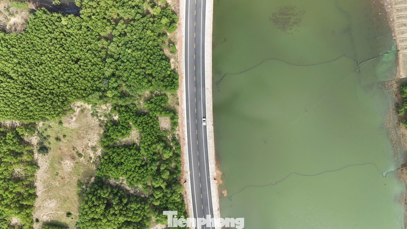 Từ trên cao nhìn xuống, con đường như một “dải lụa” vắt ngang màu xanh của rừng dương.