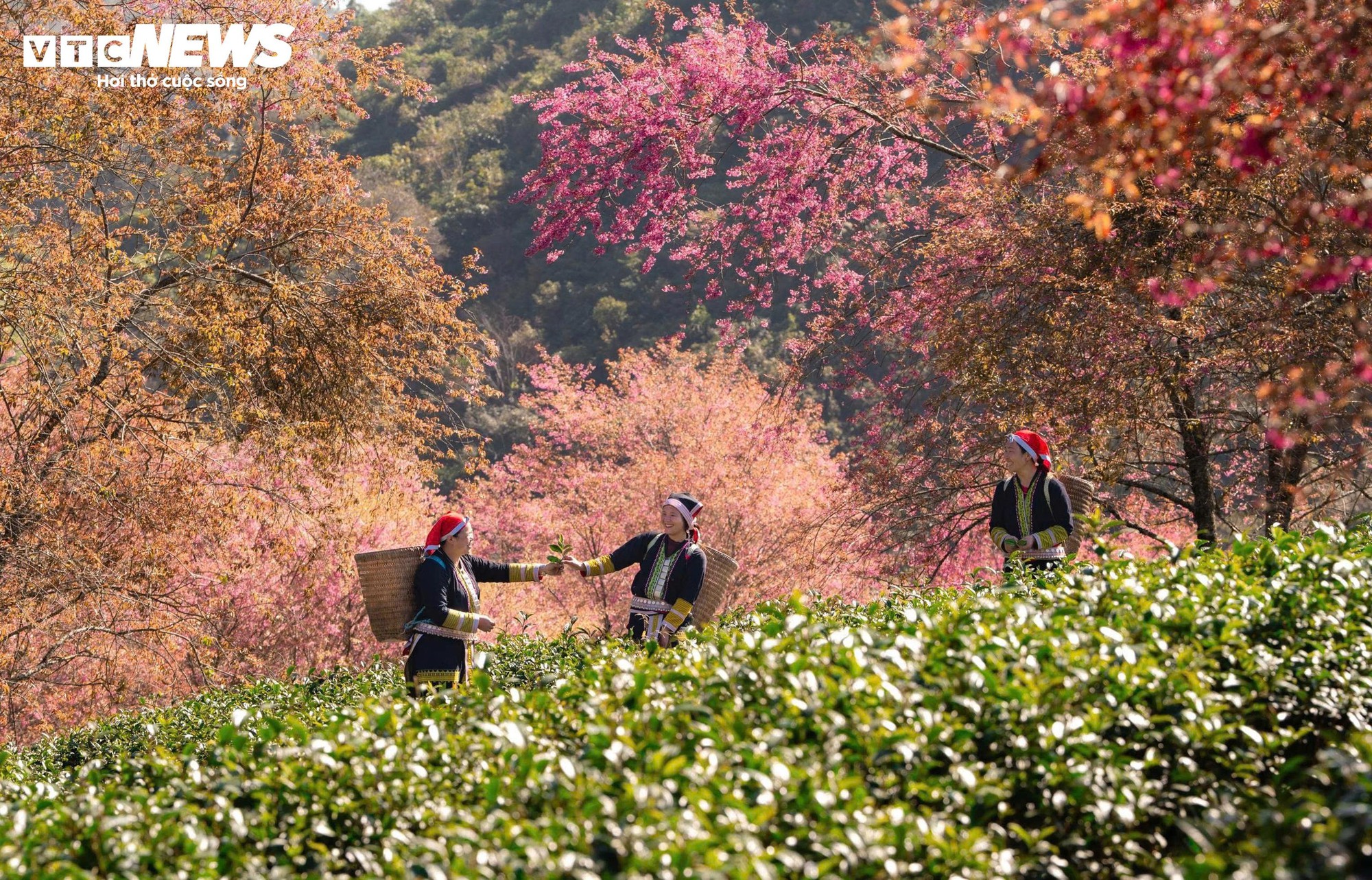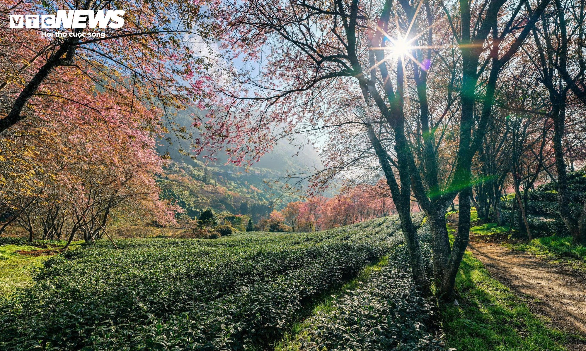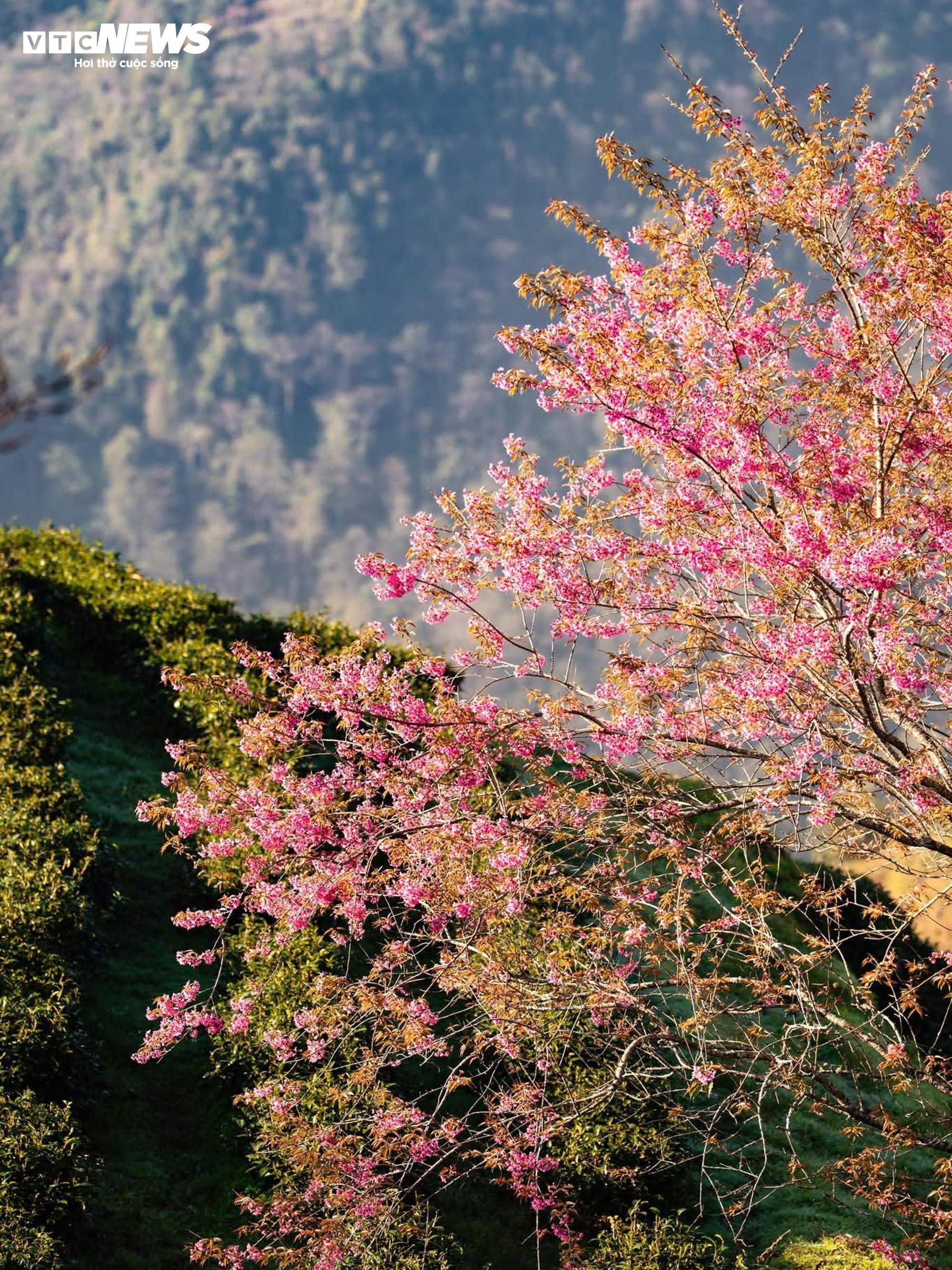 Thời điểm này, mai anh đào bung nở dày, phủ sắc hồng xen giữa những luống chè và làn mây bảng lảng trên sườn núi. Khi ánh nắng đầu ngày xuyên qua màn sương, cả khu đồi như được nhuộm một gam màu dịu nhẹ.