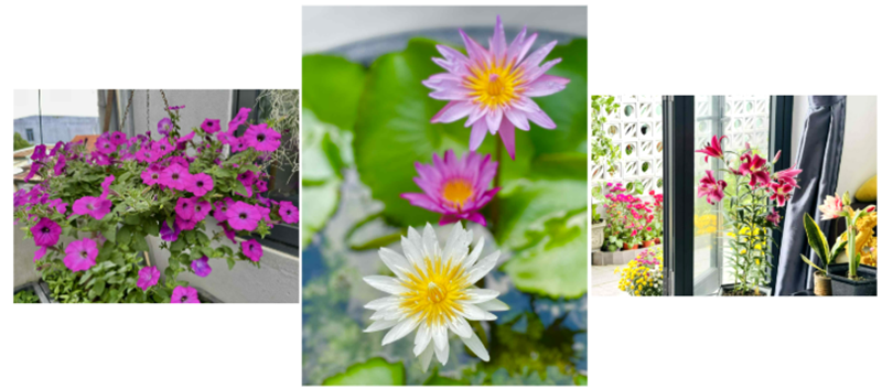 Bên cạnh rau trái, chị Ngọc còn khéo léo bài trí nhiều loại hoa như dạ yến thảo, cúc vạn thọ, thược dược và hướng dương khắp các khu vực quanh nhà để tô điểm không gian.