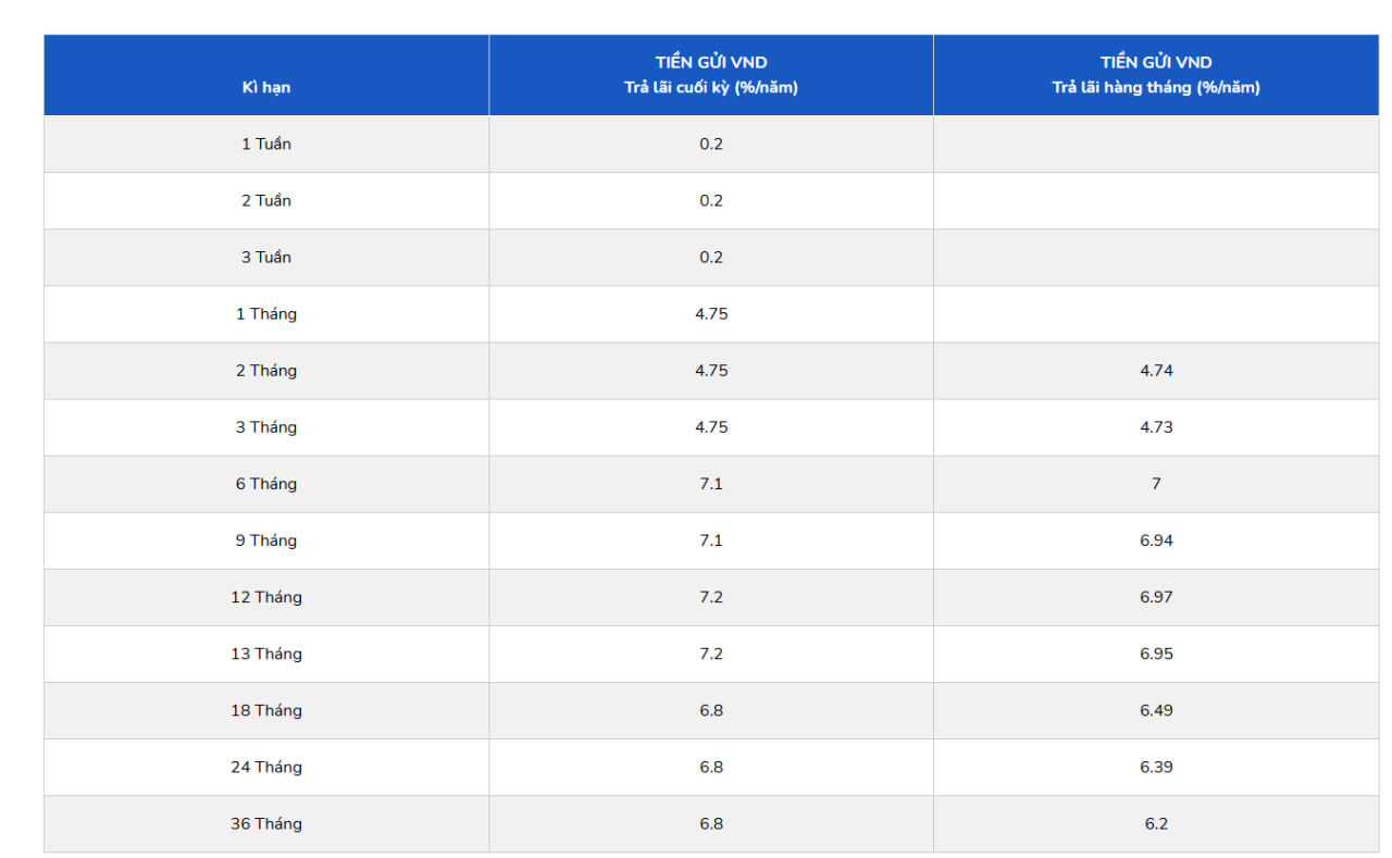 Với nhóm kỳ hạn 6 - 13 tháng, lãi suất tiền gửi tại PGBank vẫn ở mức cao. Cụ thể, kỳ hạn 6–9 tháng được niêm yết 7,1%/năm, còn kỳ hạn 12–13 tháng giữ nguyên 7,2%/năm. Sau điều chỉnh, đây trở thành mức lãi suất cao nhất trong biểu lãi suất lĩnh lãi cuối kỳ của ngân hàng này đồng thời lãi suất kỳ hạn 6 tháng còn cao hơn cả 36 tháng.