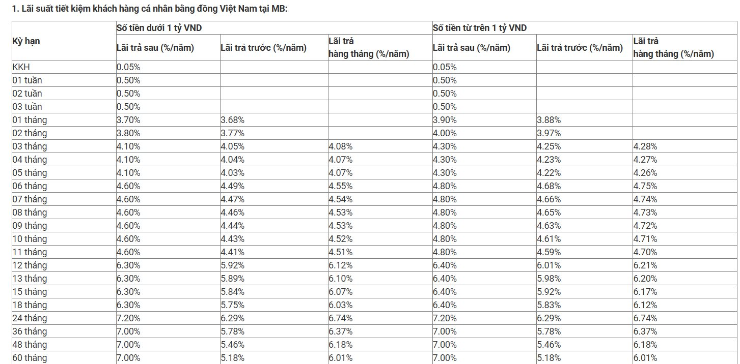 Theo biểu lãi suất tiền gửi khách hàng cá nhân tại quầy, MB tiếp tục duy trì ổn định lãi suất ở nhóm kỳ hạn ngắn dưới 6 tháng. Cụ thể, kỳ hạn 1 – 5 tháng không thay đổi, dao động quanh mức 3,7% – 4,1%/năm.
