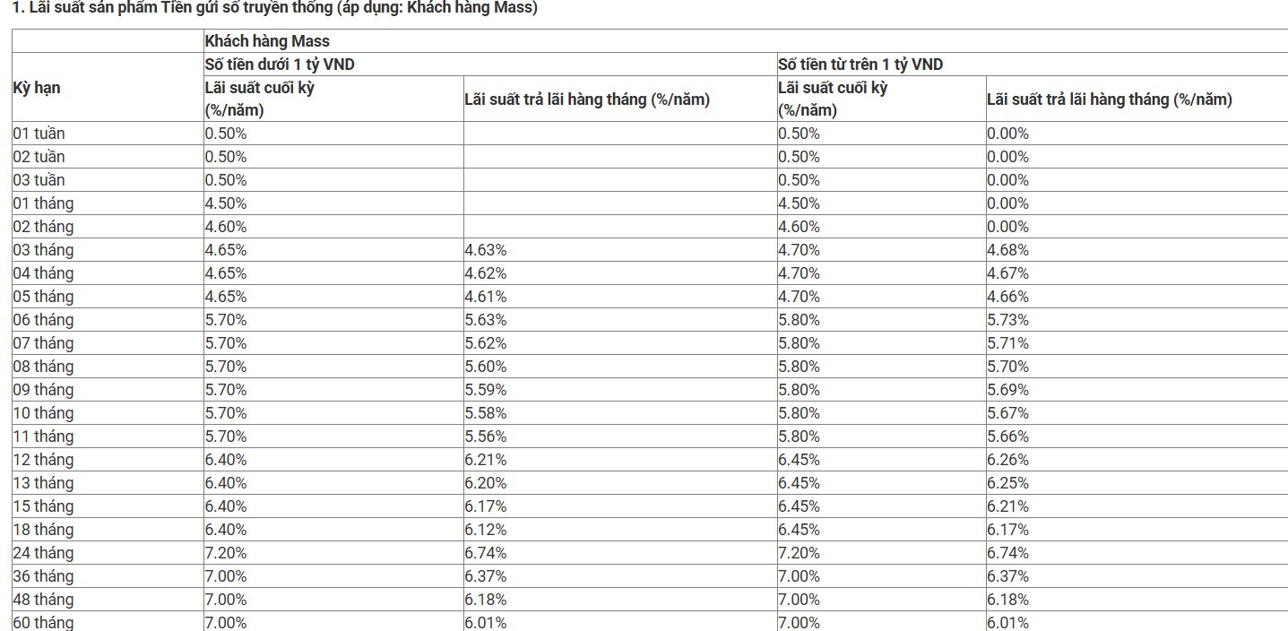 Với số tiền dưới 1 tỷ đồng, các kỳ hạn ngắn từ 1 – 5 tháng giữ nguyên trong khoảng 4,5% – 4,65%/năm. Nhóm kỳ hạn 6 – 11 tháng giảm 0,1 điểm %, xuống còn khoảng 5,7%/năm.