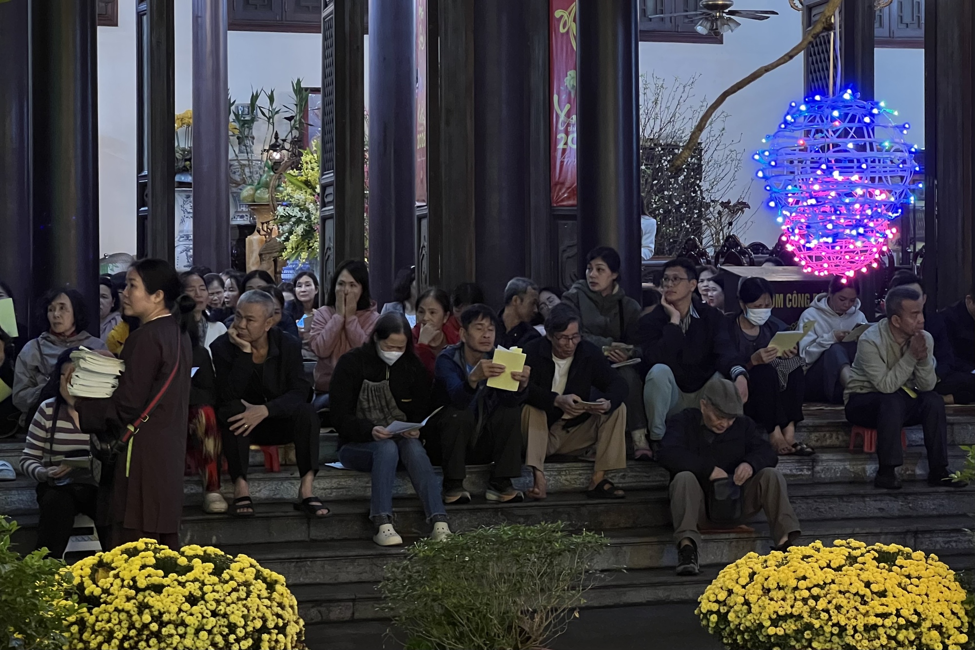 Đến khoảng 19h30, khuôn viên chùa gần như kín chỗ, người dân ngồi ngay ngắn theo sự sắp xếp của ban tổ chức