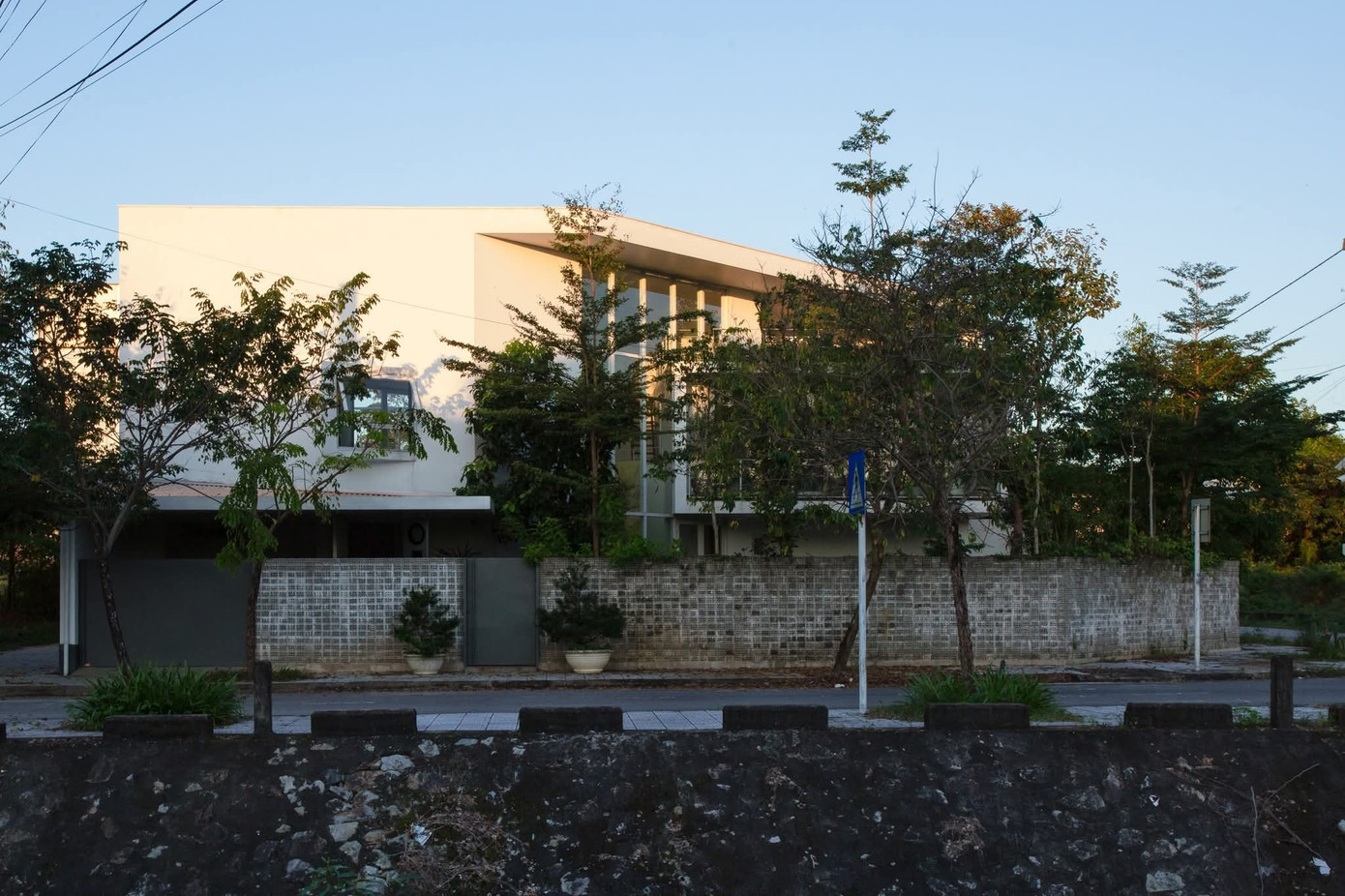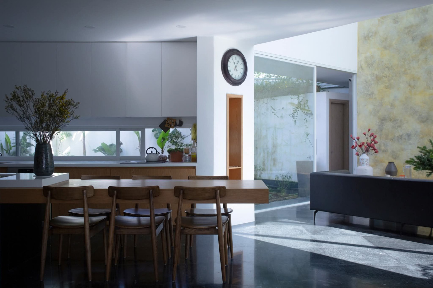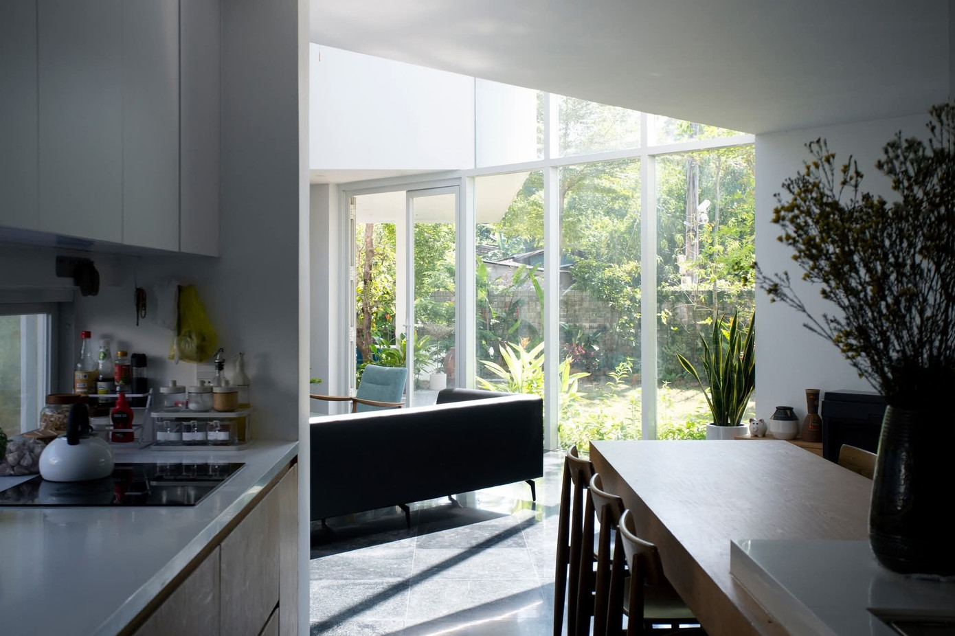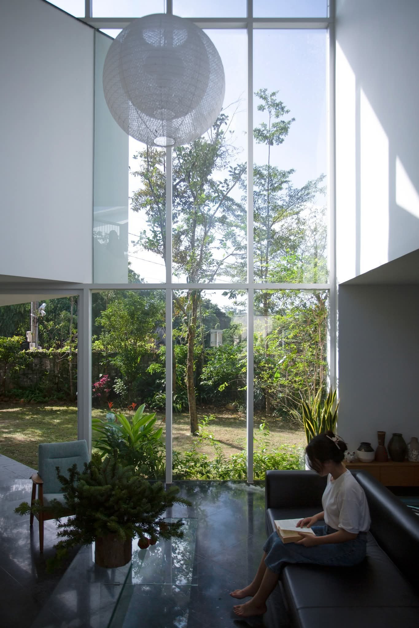 Những mảng kính cao, cửa mở linh hoạt và đối lưu chéo khéo léo giúp ngôi nhà luôn mát lành, thoáng đãng theo từng mùa. Không gian được tổ chức mạch lạc với phòng khách ở trung tâm, hai bên là những khoảng riêng tư yên tĩnh, tạo nên dòng chảy sống mềm mại và gắn kết.